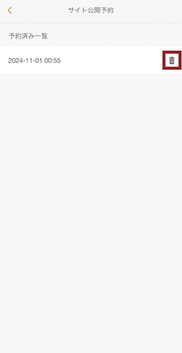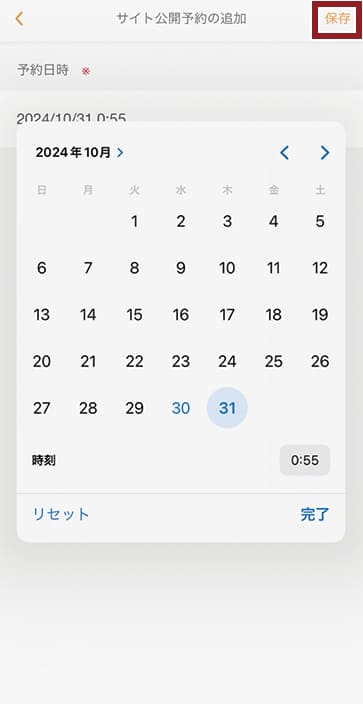 サイト公開予約の追加画面の《予約日時》にサイト公開する日時を入力する方法、またはカレンダーマークより日時を選択する方法で設定し、画面右上の「保存」をタップします。