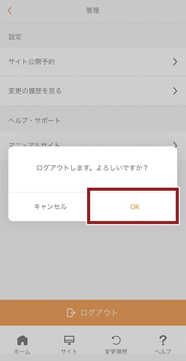 「ログアウトします。よろしいですか?」という確認メッセージの[OK]をタップします。