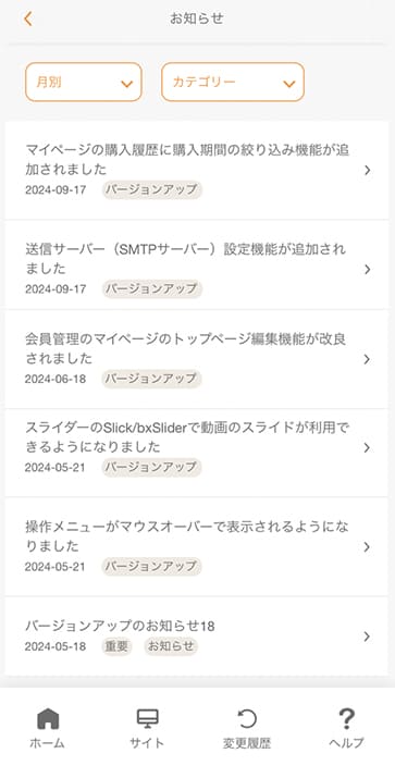 スマホアプリのホーム画面の右上に表示される[お知らせ]ボタンをタップすると、お知らせ画面(一覧)が表示されます。表示したいお知らせを絞り込む場合は、「月別」「カテゴリー」を選択します。お知らせがない場合は何も表示されません。
