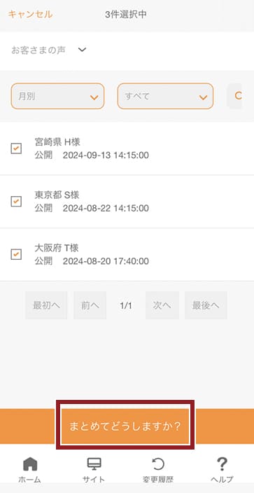 選択画面から対象のエントリーの左端にチェックを入れ、一覧の下の「まとめてどうしますか?」をタップします。