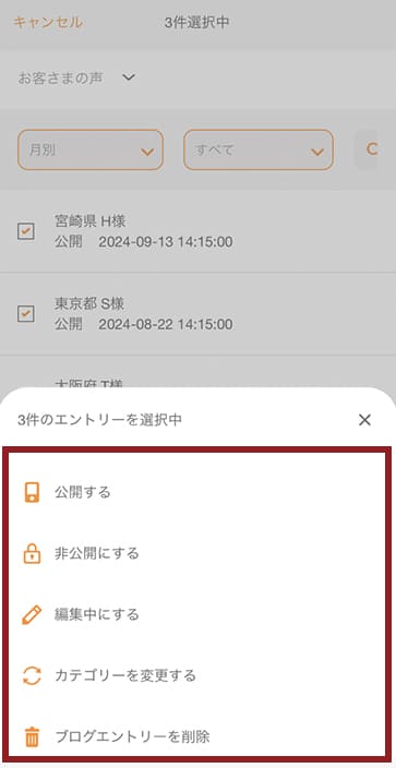「選択」をタップ時に表示されているエントリーについて一括操作を行うことができる機能となっているため、一括操作の画面(選択タップ後)から月別やカテゴリー、キーワード検索の条件を変更することはできません。絞り込み条件を変更する場合は、画面右上の「キャンセル」をタップしてブログエントリー一覧管理画面に戻って絞り込み条件を変更してから、再度「選択」をタップして一括操作を行ってください。