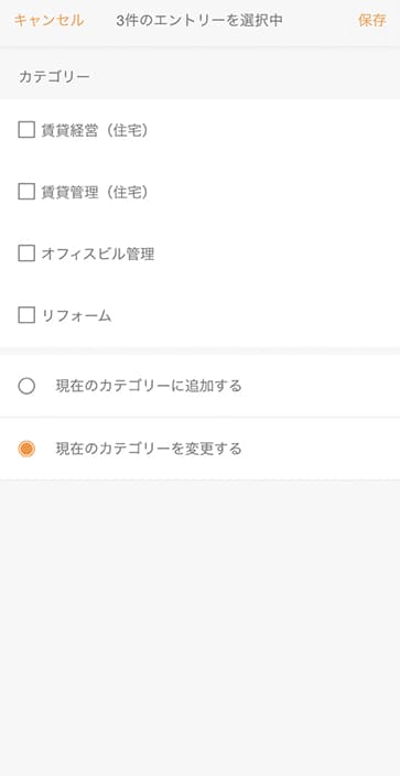 選択した更新内容のメッセージを確認して[OK]をタップすると更新完了です。「カテゴリーを変更する」の場合は、カテゴリーの選択画面が表示されます。カテゴリーにチェックを入れて変更方法を選択し、画面右上の「保存」をタップします。メッセージを確認して[保存]をタップすると保存完了です。