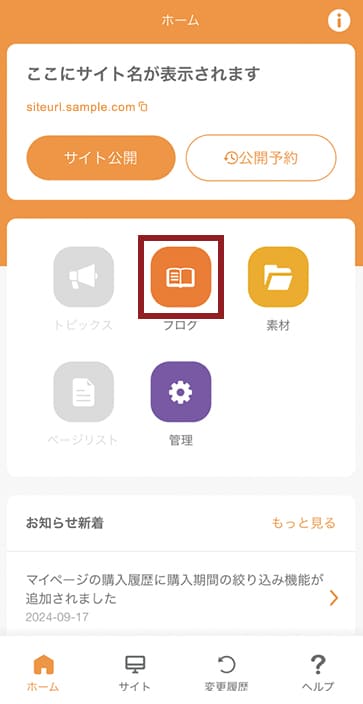 | ブログ名 | ブログ名が表示されます。サイト内にブログコンテンツが複数ある場合は、ブログ名をタップするとブログ一覧画面からブログを選択することができます。 |