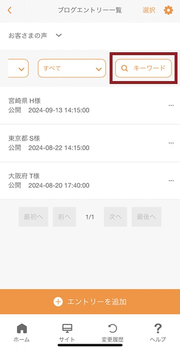 ブログエントリー一覧画面に表示されたエントリーを絞り込む場合は、「月別」「カテゴリー」を選択します。キーワードで検索する場合は、「キーワード」を選択し、キーワードを入力して[検索]ボタンをタップすると検索ができます。