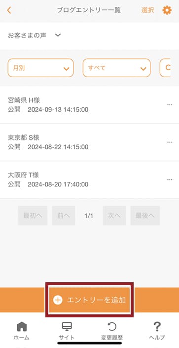 ブログエントリー一覧画面からエントリーの追加や各種操作を行うことができます。