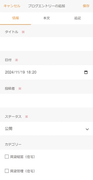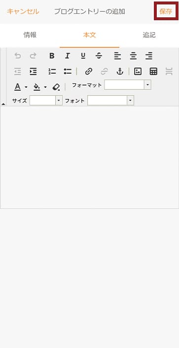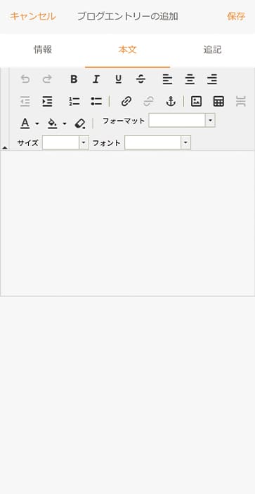 画面下の[エントリーを追加]ボタンをタップすると、ブログエントリーの追加画面が表示されます。