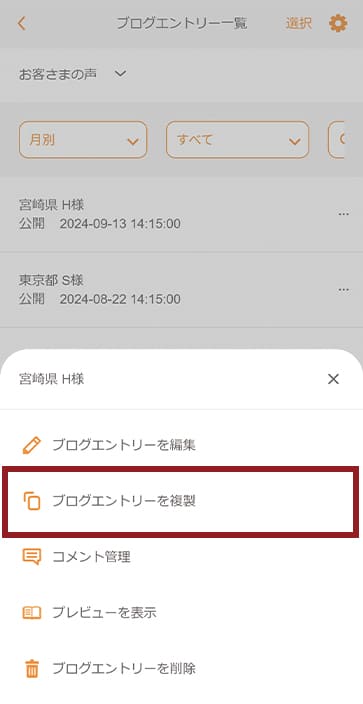 ブログエントリー一覧画面を表示し、複製したいエントリーの[エントリーメニュー]ボタンをタップします。