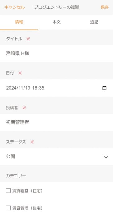 ブログエントリーの複製画面が表示されます。ダイアログの各項目やタブの詳しい内容は、下記のエントリーの追加の詳細を参照してください。