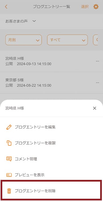 ブログエントリー一覧画面を表示し、削除したいエントリーの[エントリーメニュー]ボタンをタップします。