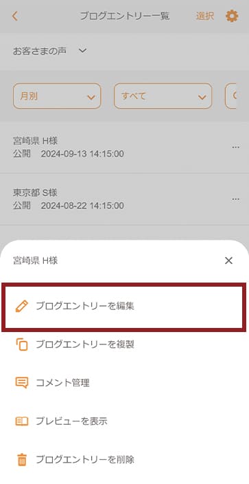 ブログエントリー一覧画面を表示し、編集したいエントリーの[エントリーメニュー]ボタンをタップします。