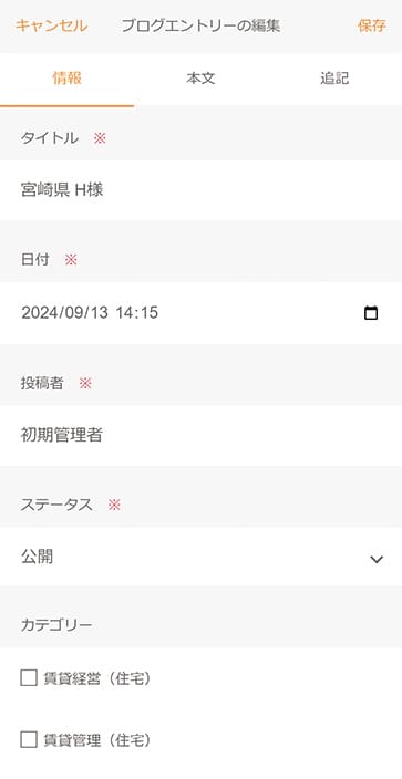 投稿者 エントリーの投稿者を設定します。エントリー追加直後はログインアカウントの氏名が入力されます。
