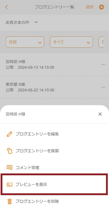 ブログエントリー一覧画面を表示し、プレビューで確認したいエントリーの[エントリーメニュー]ボタンをタップします。