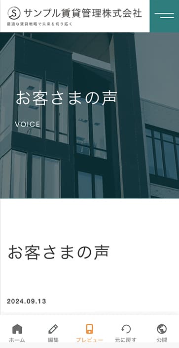編集サイト(プレビューモード)に切り替わり、ブログエントリー詳細ページが表示されます。編集モードに切り替える場合は、グローバルメニューの[編集]ボタンをタップしてください。詳しい内容は「編集サイト」について参照してください。