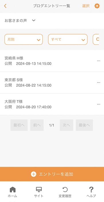 • サイト内にブログコンテンツが複数ある場合は、ブログエントリー一覧画面のブログ名をタップして対象ブログを変更することができます。