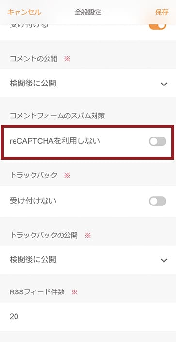 全般設定画面が表示されますので、《コメントフォームのスパム対策》を「reCAPTCHAを利用する」に切り替えます。