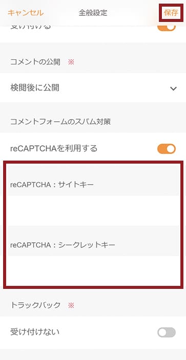 手順1で取得したreCAPTCHAの「サイトキー」および「アクセスキー」を入力します。画面右上の「保存」をタップし、メッセージを確認して[保存]をタップします。保存後はブログ設定画面が表示されます。