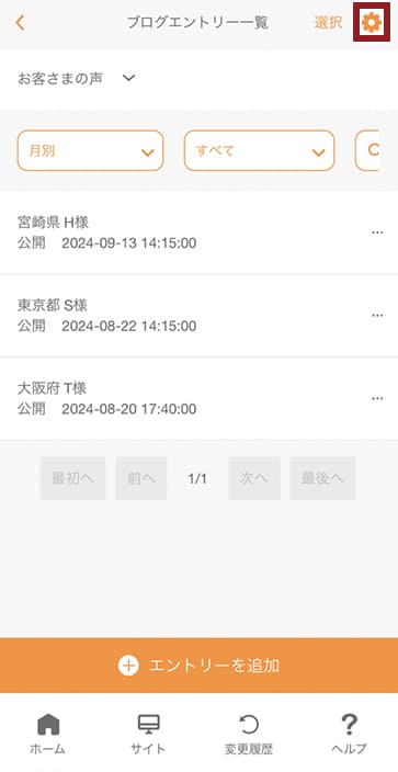 - ブログエントリー一覧画面でブログを変更したい場合は、ブログ名をタップして変更してください。