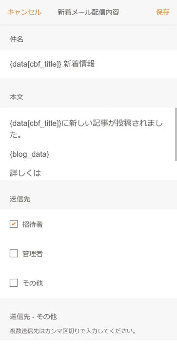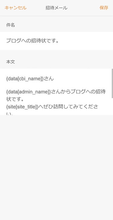 ブログの公開対象が招待した人だけに公開している場合に[招待者管理]より招待する際に送る「招待メール」の内容を設定します。