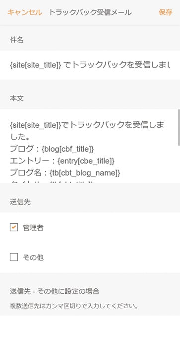 トラックバック受信メールの件名を設定します。以下のタグを設定すると各項目の内容が挿入されます。