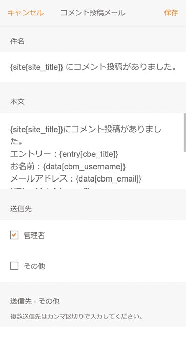 新しいコメントが投稿された際に配信される「コメント投稿メール」の内容を設定します。