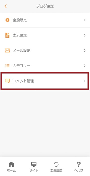 ブログ設定画面を表示し、[コメント管理]をタップします。