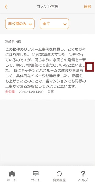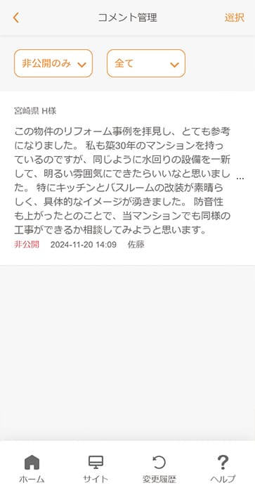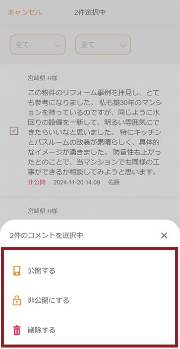 コメントを選択して一括操作(公開・非公開の変更、コメントの削除)をすることができます。