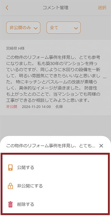 • 「非公開にする」・・・コメントのステータスを「非公開」に変更します。