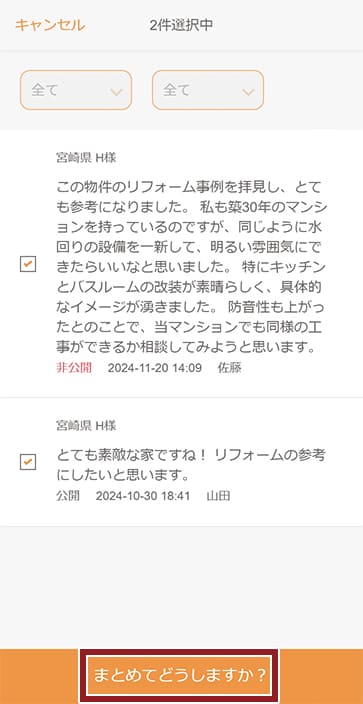 選択画面から対象のコメントの左端にチェックを入れ、一覧の下の「まとめてどうしますか?」をタップします。