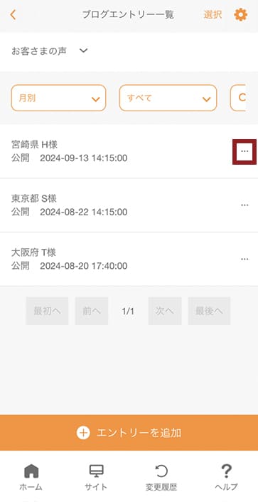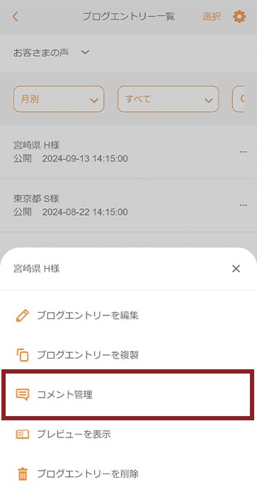 ブログエントリー一覧画面を表示し、コメントを管理したいエントリーの[エントリーメニュー]ボタンをタップします。