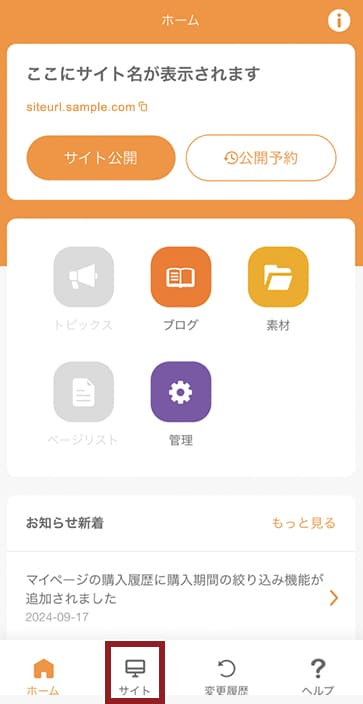 スマホアプリは、PCサイト専用の編集機能となります。サイト設定でモバイルサイトが「あり」に設定されている場合は、スマホアプリをご利用いただくことができません。