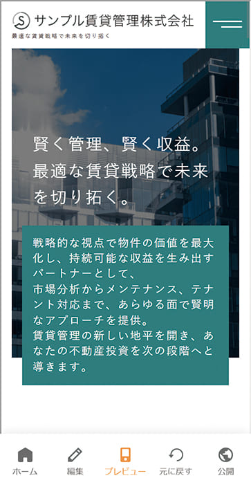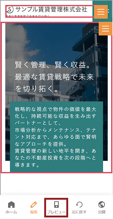 編集サイト(編集モード)の下部に表示されるグローバルメニューの[プレビュー]ボタンをタップするとプレビューモードに切り替えることができます。