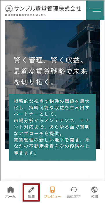編集サイト(プレビューモード)の下部に表示されるグローバルメニューの[編集]ボタンをタップすると編集モードに切り替えることができます。