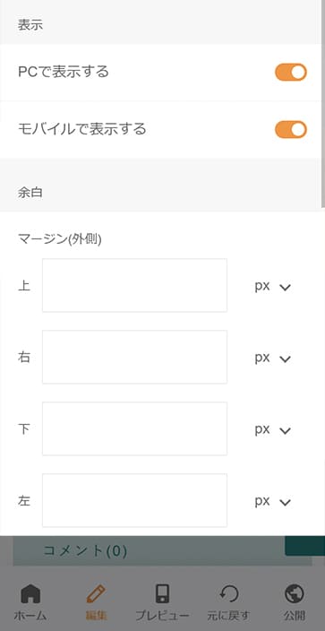 | 余白 | 余白を指定する場合は、外側の余白(マージン)、内側の余白(パディング)の上・下・左・右に半角数字(マイナス値入力可能)を入力し、単位(pxまたは%)を選択します。