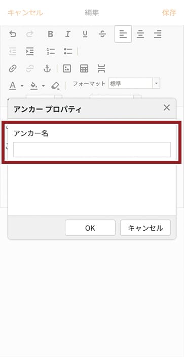 “アンカープロパティ”の設定画面が表示されますので、アルファベットから始まる任意のアンカー名を半角英数字(記号不可)で入力します。