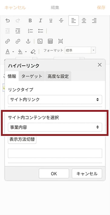 | サイト内のページを設定する場合 | サイト内コンテンツの一覧から該当するページのページタイトルを選択します。