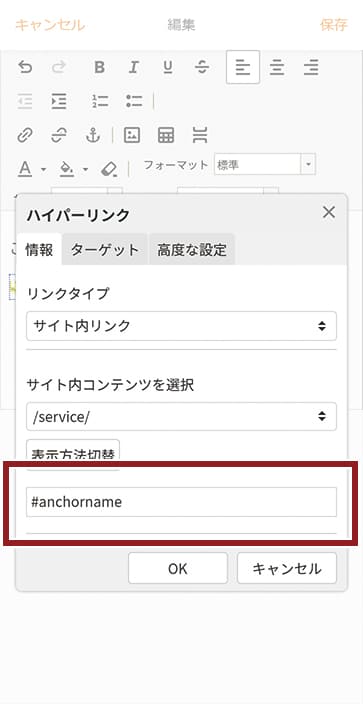 - アンカーが異なるコンテンツパーツに存在する場合、ダイレクト編集時にはアンカー名が表示されません。その場合は、ページの編集画面にてリンクを設定してください。