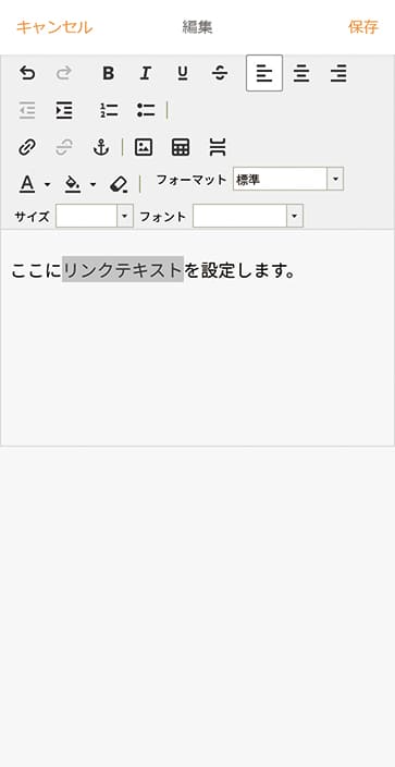 編集画面(エディタ)でリンクを設定したいテキストや画像を選択します。