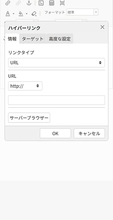 | リンク先にファイル等を設定する場合 | [サーバーブラウザー]ボタンをタップし、“サーバーブラウザー”の中からリンク先のファイルを選択します。ファイルの種類は“サーバーブラウザー”の左上に表示される「ファイルタイプ」の一覧からファイル(File)や画像(Image)を切り替えることができます。 |