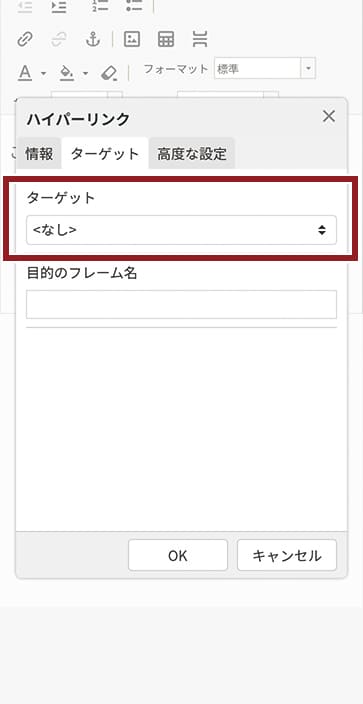 次に、手順4のリンクタイプで「URL」、もしくは「サイト内リンク」を選択した場合、リンク先のページを開くウィンドウを同一ウィンドウにするか、新しいウィンドウを開くのか等、リンク先のターゲット設定をします。(何も設定しない場合は、<なし>に設定されています。)