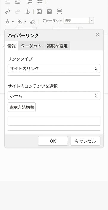 - テキストの選択の際には、改行を含まない同じ行内の連続するテキストを選択してください。(段落区切りを含む複数行を選択してリンクを設定すると不具合が生じます)