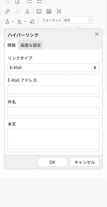 | メールアドレスへのリンクを設定する場合 | 「E-Mail アドレス」にメールアドレスを入力します。「E-Mail」を設定しているリンク元をクリックすると、閲覧者の使用しているメーラーの新規作成画面が起動します。 |