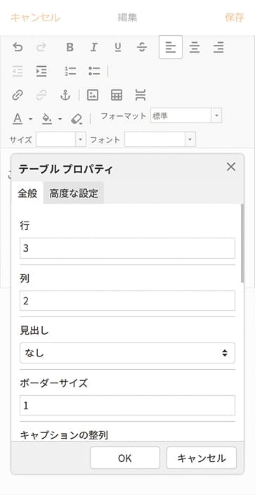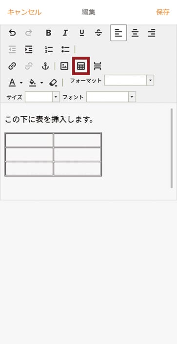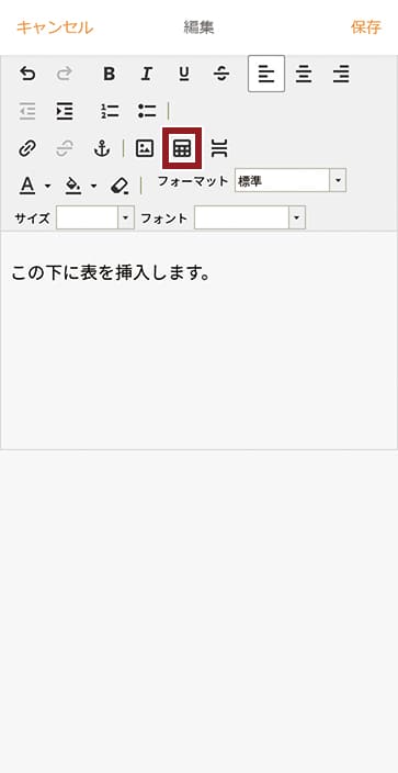 編集画面(エディタ)でテーブル(表)を挿入したい位置にカーソルを置き、ツールバーの[テーブル挿入/編集]ボタンをタップします。