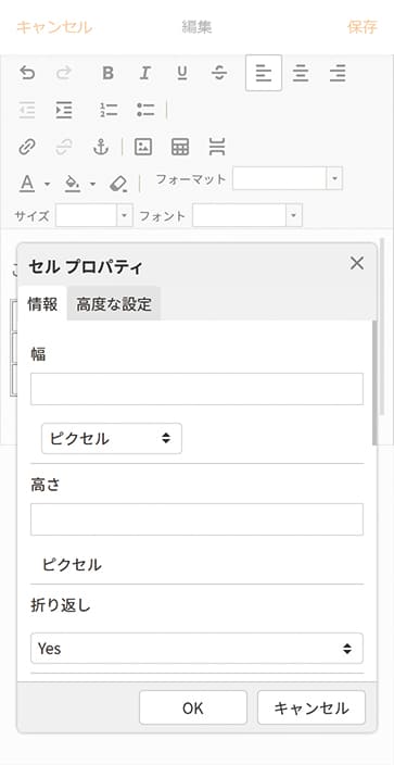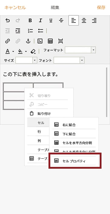 編集画面(エディタ)で設定したいセル内を長押しをし、表示されるショートカットメニューから[セル]を選択し、設定したいメニューを選択します。詳しくは下表を参照してください。
