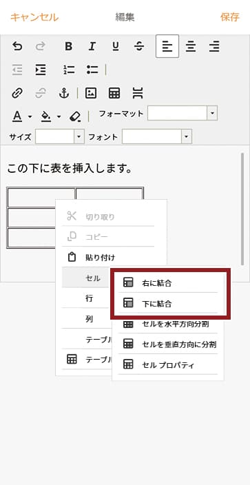 | 上下のセルと結合する | 挿入したい上下2つのセルの上のセル上で長押しをし、表示されるショートカットメニューから[セル] → [下に結合]を選択します。 |