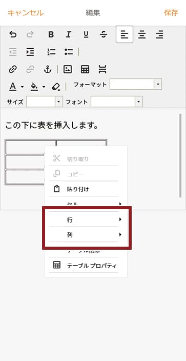 編集画面(エディタ)で編集したい箇所の上で長押しをして、ショートカットメニューの[行]または[列]を選択し、設定したいメニューを選択します。詳しくは下表を参照してください。