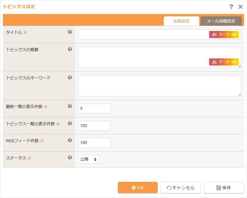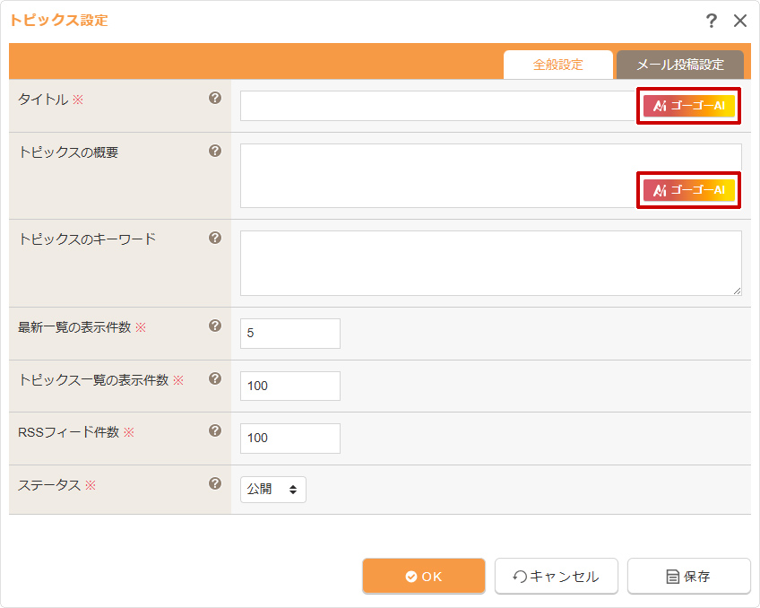| タイトル | 該当トピックスのタイトルを設定します。 [AIアイコン] |