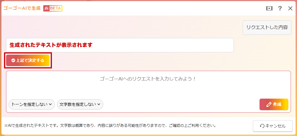 AIが生成した文章を確認し、問題なければ[上記で決定する]ボタンをクリックします。決定した文章はダイアログの編集内容に反映されますので、必要に応じて修正してください。