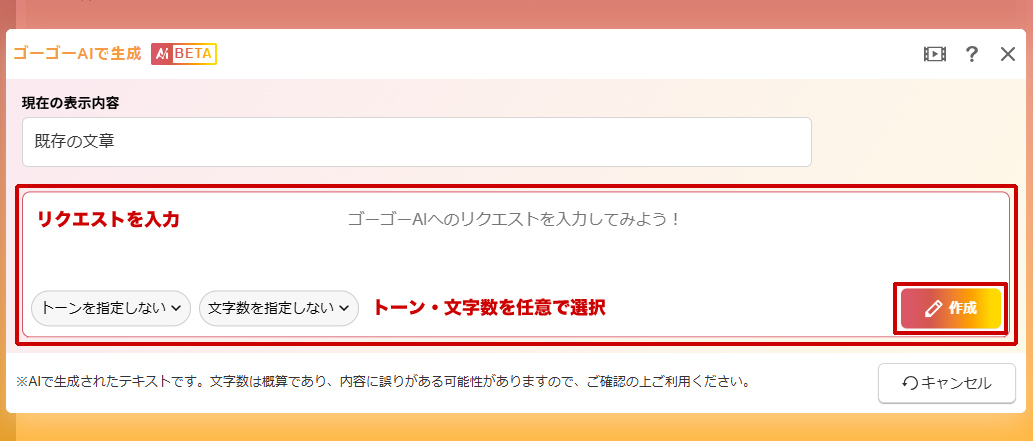 “AIダイアログ”が表示されます。作成したい内容を入力して[作成]ボタンをクリックします。詳しい操作は「ゴーゴーAIで生成(べータ版)」を参照してください。