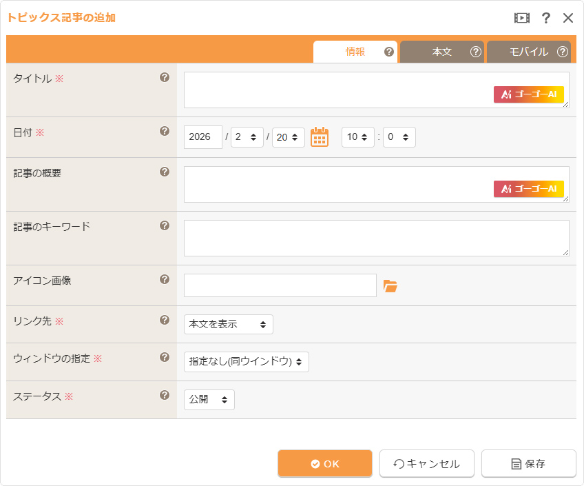 コントロールパネルから[作成] → [新規作成] → [ニュースを書く]を選択すると、“トピックス記事の追加ダイアログ”が表示されます。