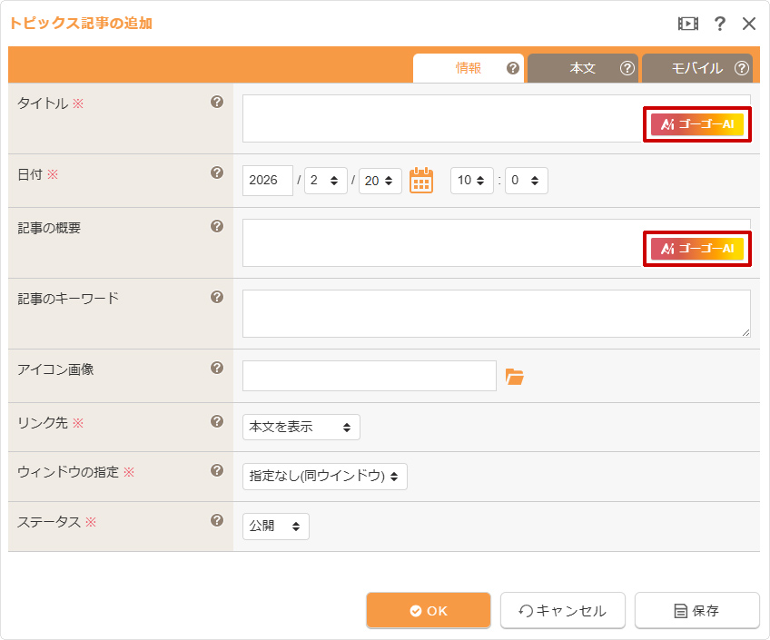 “トピックス記事の追加ダイアログ”の《タイトル》または《記事の概要》の[AIアイコン]